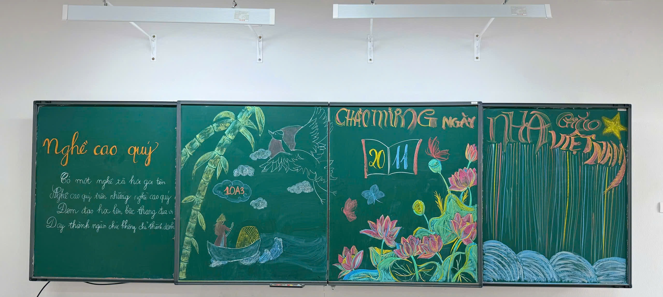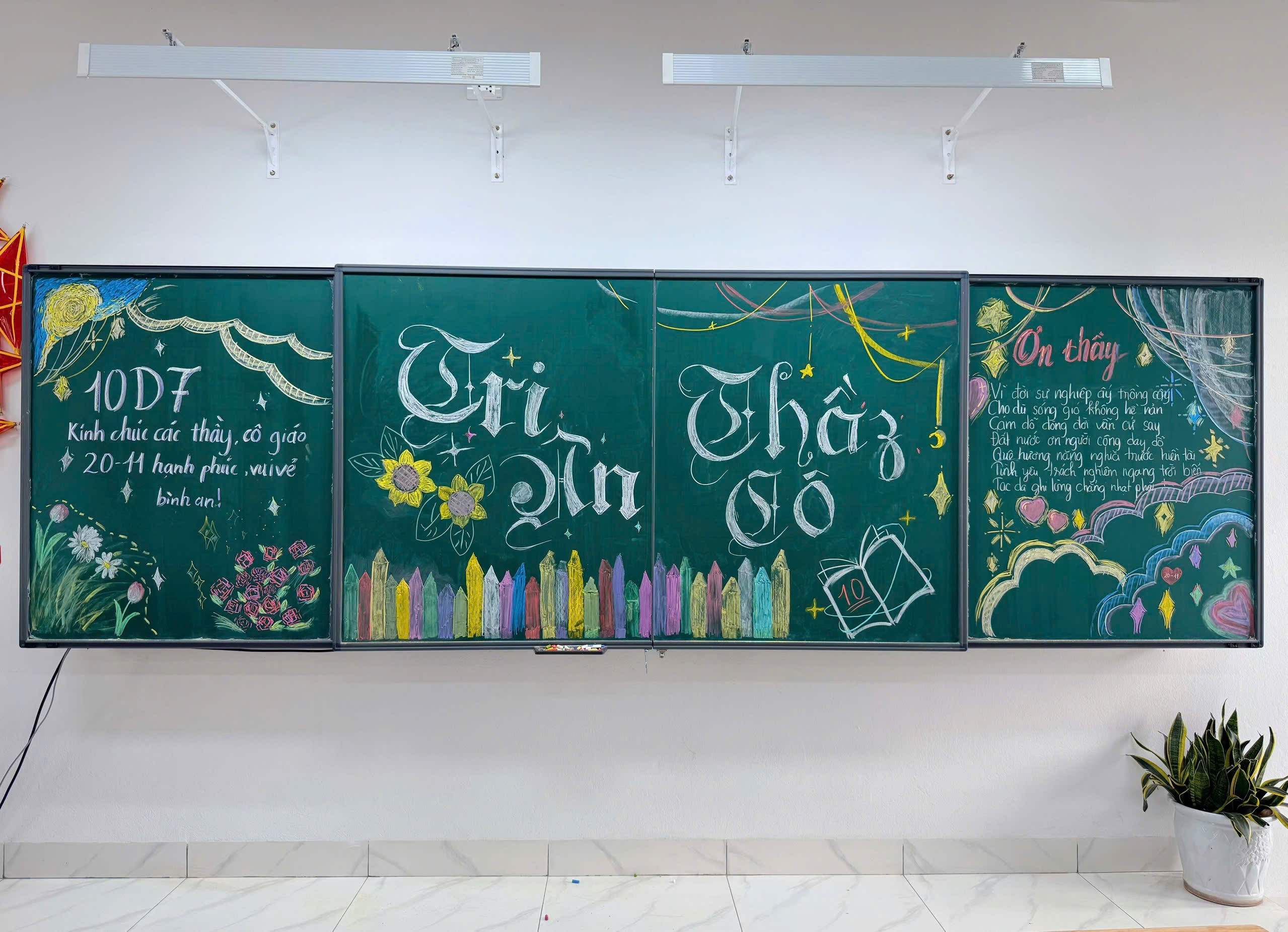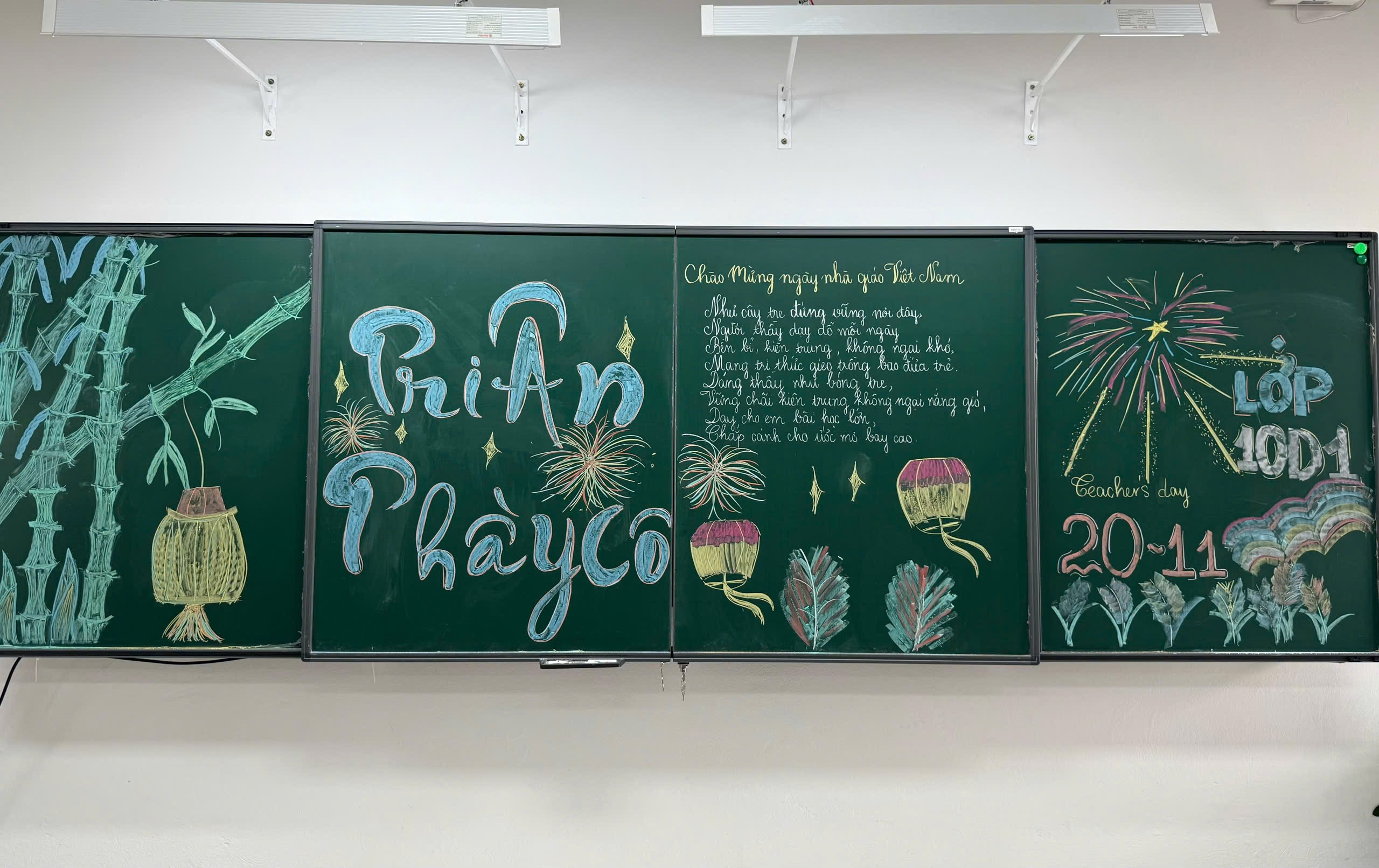 Hướng tới kỷ niệm Ngày Nhà giáo Việt Nam 20/11, các tập thể lớp trong trường đã đồng loạt thực hiện trang trí bảng lớp với nhiều ý tưởng sáng tạo và đầy màu sắc. Từ những nét vẽ tỉ mỉ, những câu chúc, những bài thơ ý nghĩa, đến cách phối màu tinh tế, tất cả đã tạo nên không khí rộn ràng, ấm áp trong từng lớp học. Mỗi tấm bảng là một thông điệp tri ân gửi đến thầy cô – những người tận tâm gieo chữ, thắp sáng ước mơ cho học trò.