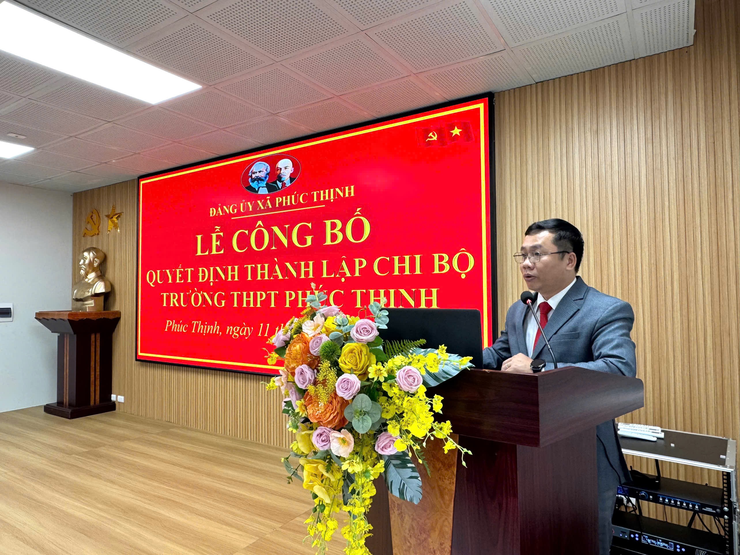 Đồng chí Đặng Minh Thắng – Phó Bí thư Thường trực Đảng ủy xã Phúc Thịnh, phát biểu chỉ đạo tại buổi lễChi bộ Đảng trường THPT Phúc Thịnh thành lập đánh dấu một bước phát triển quan trọng trong quá trình xây dựng và trưởng thành của tập thể sư phạm, khẳng định vai trò hạt nhân chính trị của tổ chức Đảng trong công tác lãnh đạo toàn diện mọi hoạt động của nhà trường.