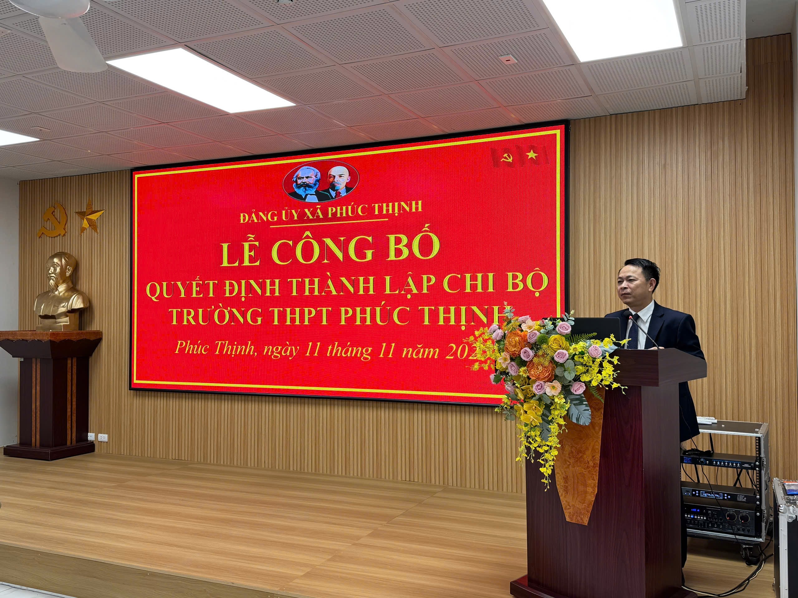 Phát biểu tại buổi lễ, đồng chí Đặng Minh Thắng – Phó Bí thư Thường trực Đảng ủy xã Phúc Thịnh giao nhiệm vụ cho Chi bộ, bày tỏ sự tin tưởng rằng Chi bộ trường THPT Phúc Thịnh sẽ phát huy tinh thần đoàn kết, trách nhiệm, giữ vững bản lĩnh chính trị, hoàn thành tốt nhiệm vụ được giao; đồng thời tiếp tục lãnh đạo, chỉ đạo đội ngũ cán bộ, giáo viên, nhân viên và học sinh nỗ lực xây dựng nhà trường ngày càng phát triển vững mạnh.