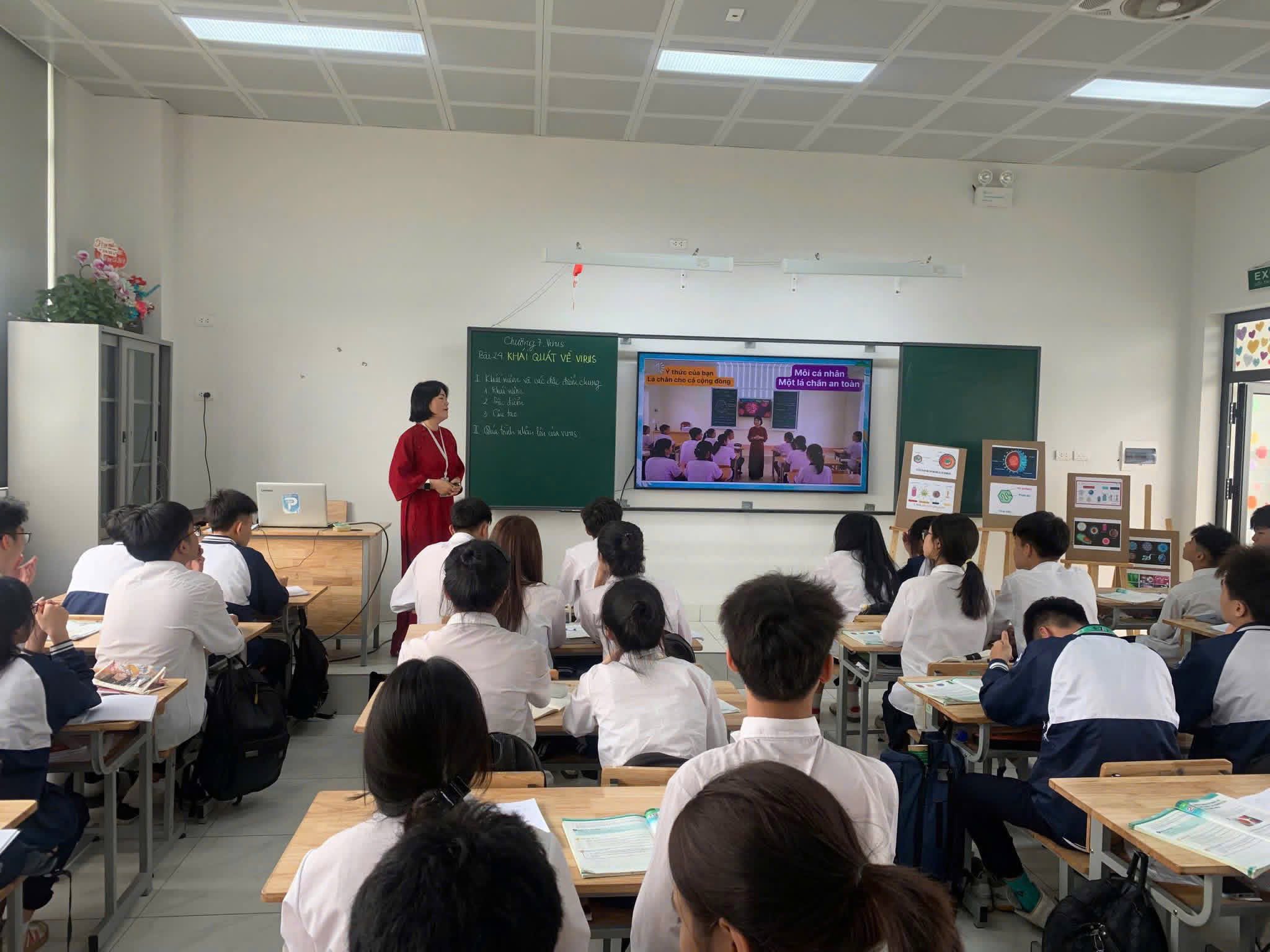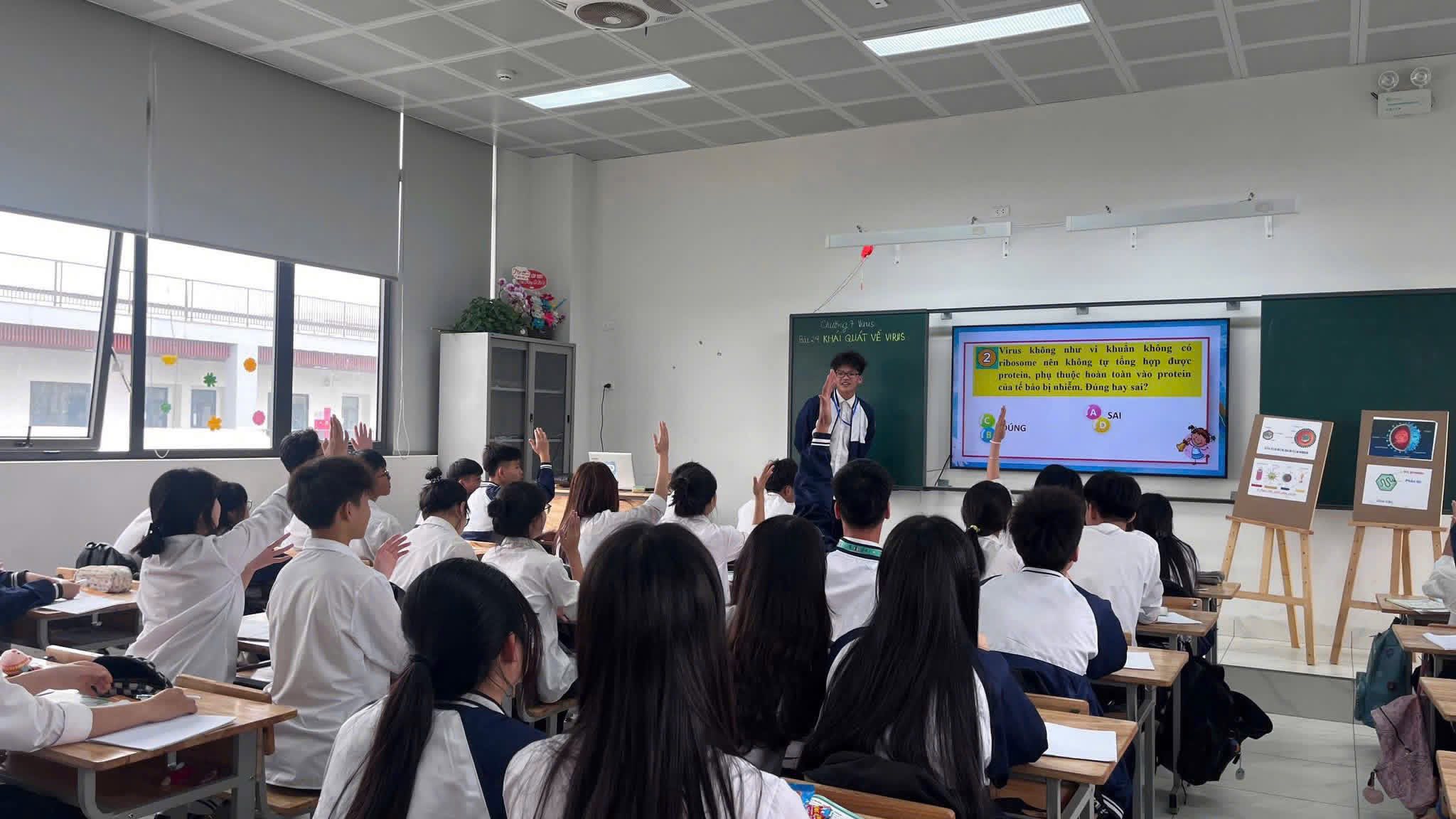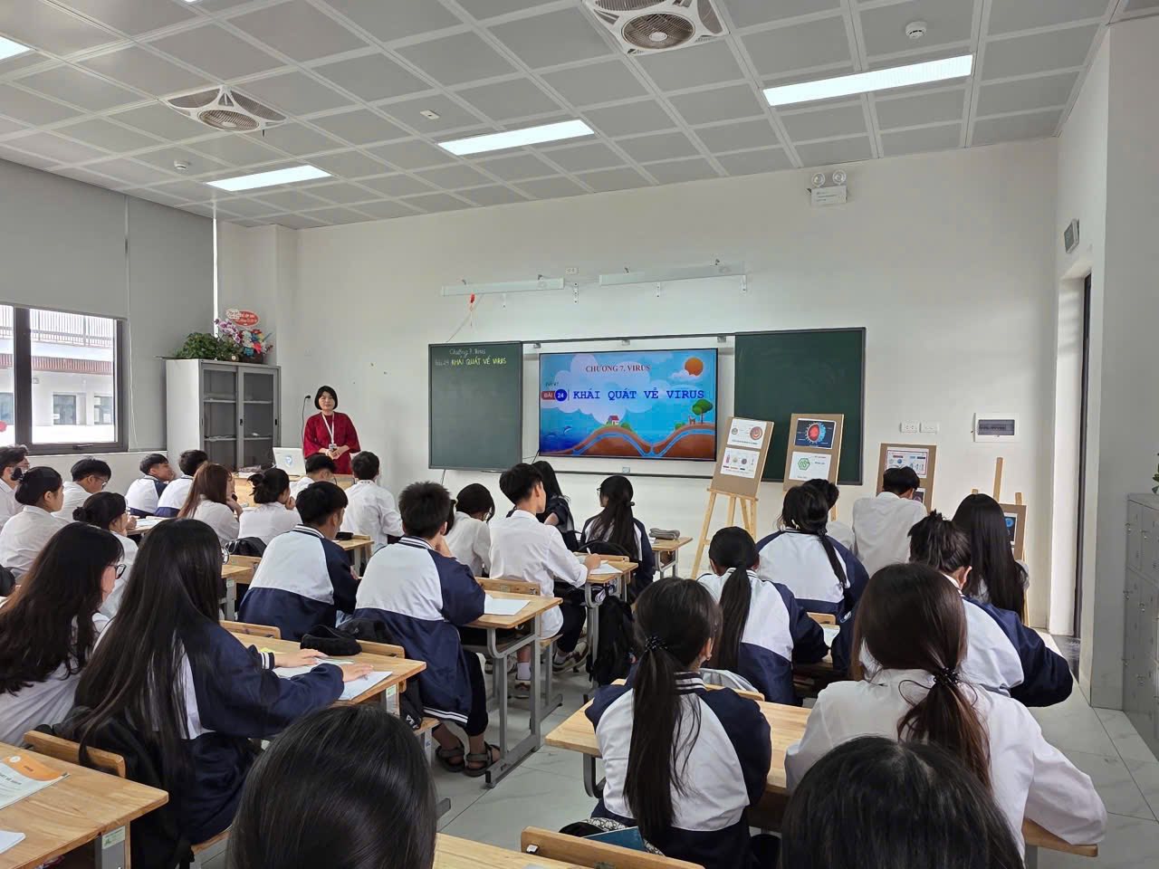 Môn Sinh học 10 – Bài: "Khái quát về virus" do cô Nguyễn Thị Dung - tổ KHTN thực hiện tại lớp 10D7. Tiết học được cô Dung sử dụng nhiều phương pháp đổi mới: dạy học dự án, lớp học đảo ngược, tích hợp AI, triển lãm phòng tranh,... Phương tiện dạy học cô đã sử dụng công cụ AI (Suno, Gemini, chat GPT, dreamina.CapCut, speechify.com), padlet, google Drive, khung giá vẽ. Tiết học vô cùng sinh động và ấn tượng giúp HS hiểu được khái niệm, đặc điểm chung và quá trình nhân lên của virus trong tế bào chủ. Từ đó, HS chủ động bảo vệ sức khỏe bản thân, học được cách phòng tránh dịch bệnh do virus gây ra.